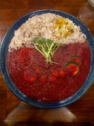 レッドベルベットカレー 花椒煮玉子 カルト映画の巨匠デビッド・リンチ監督への哀悼の意を込めたカレー。ビビッドな赤がデビッド・リンチの作品『ツイン・ピークス』の「赤い部屋」を彷彿させます。ビーツベースのカレーに辛さはほぼ無く、複雑なスパイス感をゆっくり感じる穏やかで上品な味わい。それでいてビシッと存在感のある仕上がり。具材は海老、ズッキーニ、ミニトマト、菜の花。ライスは雑穀ジャスミンライス。ジャスミンライスの香りとスパイシーなカレーが一体になって、具材や米の美味しさ一つ一つを引き立たせていて、尚且つ全体をしっかり調和させています。付け合わせのぬか漬けもベストなアクセントに。花椒煮玉子は、そのまま頂いてもカレーと合わせて食べても良い。インドだけで無く日本のスパイスも使って仕上げた繊細且つ大胆なカレー。赤だしみそ汁もすごく合う。