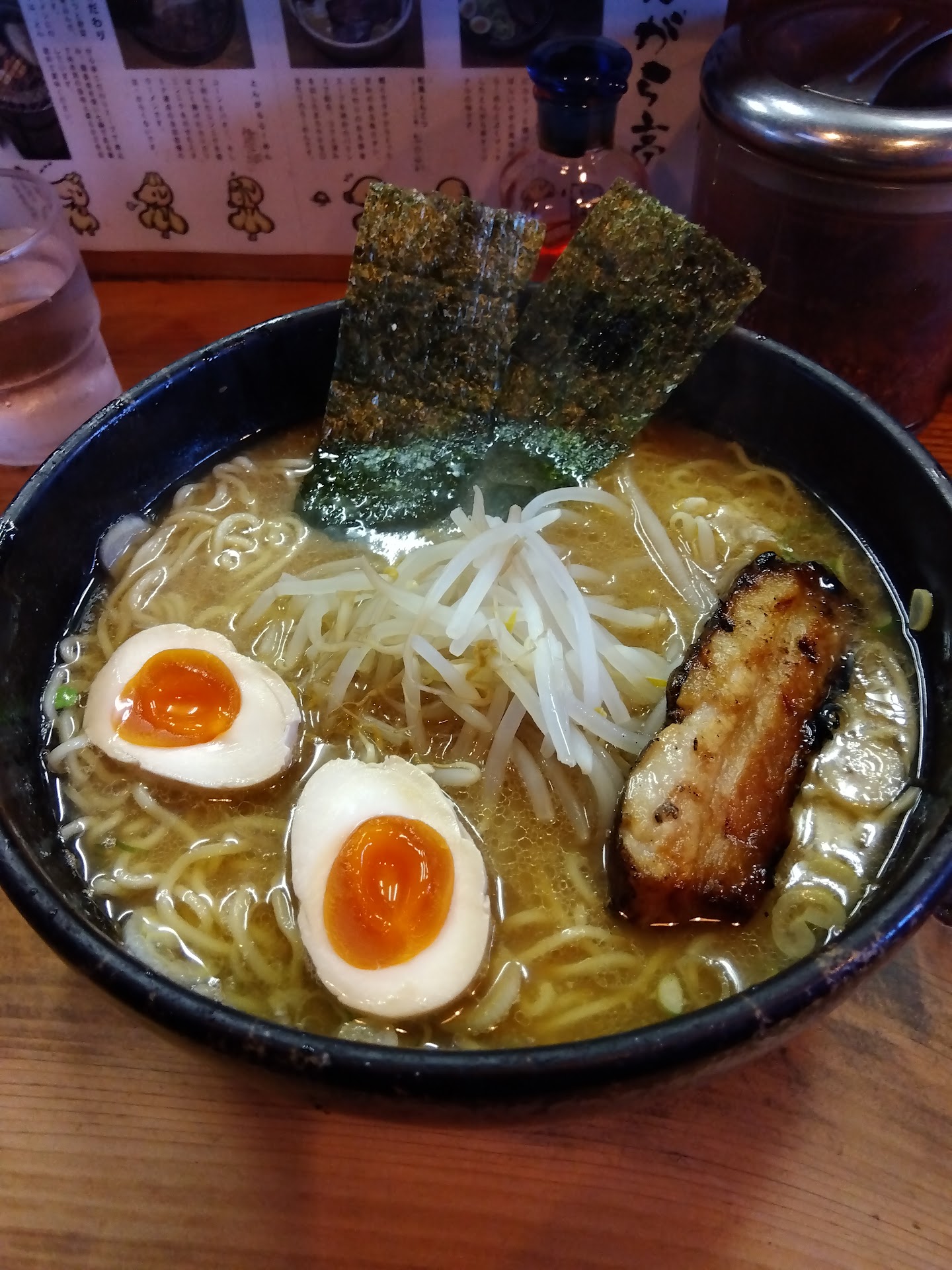 ①まさか、あの立川市にあった伝説だった?人気の『あじまる』の後継の店と言うことで、問い合わせところ、当時のらーめんを提供できるとので、期待度MAX✨! 30年前、立川で働いていた時、何度も食べていた、ホープ軒系のらーめんだと記憶がある。いつの間にか閉店されて、がっかりしてました😞。 店名の〝とんがら〟ではなく、想い出の再現〝あじまる〟のらーめんを実食。 店長の優しさに感激。1990年代の想い出と共に、 感動の復活。 とんがら亭〝あじまる〟は、 麺は違うが、スープはこんな感じだったかな。他は、進化して、味玉は半熟になり、チャーシューは炙りに、ネギは入れ放題に、より、サービスが客寄りになっているのは、ありがたい。 一番の違いは、どんぶりの色かも知れません。 もし、当時の様な空色?ならば、視覚的に味が、空色イコール〝あじまる〟と記憶が結びつきます。 次回は、店名の〝とんがら〟か、未知の〝和風とんこつ〟か?美味しいかったので、次回、確定です。 店長さん、本日は、ありがとうございました。
