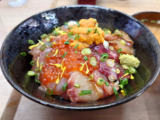 初めてお伺いさせて頂きました。 市場には食堂が多くありますが、会員初回登録で市場満喫セットが1,580円→1,000円の割引に釣られて注文しました。 お店で注文して目の前のイートインスペースで頂きました。 呼び出しのポケベルも用意してくれているので料理提供まで近くを散策出来ます。 さて程なくして海鮮丼プラスチキンカレーがセットの市場満喫セットが着丼。 サイズは海鮮丼、チキンカレー両方ともミニサイズで、プラス付け合わせ、お味噌汁が付いてました。 ガッツリ食べたい人には少し足りないかもしれませんが、海鮮丼がマグロ足し(有料)のアップグレードが出来ます。 量が分からなかったので普通サイズにしました。 まず、海鮮丼は甘めの特製だれが海鮮にとても合い美味しいです。とくにマグロの赤身が美味しかった。 チキンカレーもスパイスが効いていてビーンズも美味でした。 量も丁度良く、食べすぎない程度がGood。 店主さんと女性の従業員さん(女将さん?)もとても対応が良かったです。 週末は混みそうなので平日だとゆっくり味わえますね。 またお邪魔させて頂き...