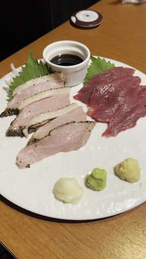 続けて馬刺し。鴨と馬の2種盛り。 臭みは一切なく、滑らかで柔らかい肉質が印象的。 わさびと生姜、少しの醤油がその旨味を引き立てる。