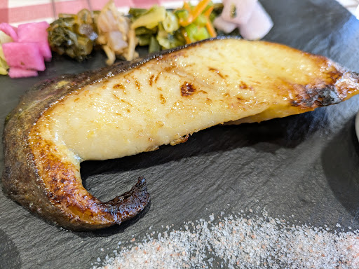 Read more恐らくご夫婦で営業なさっている、こじんまりとしたカフェレストラン。通りから外れた閑静なエリア、タワマンの1Fと言う立地はお世辞にも良いとは言えないはずだが、日曜昼の店内は満卓の盛況ぶり。 定番ランチメニューに日替わりのラインナップで、この日は大好きな銀鱈西京焼きが日替わりメニューに採用されており、即決で入店そして注文。