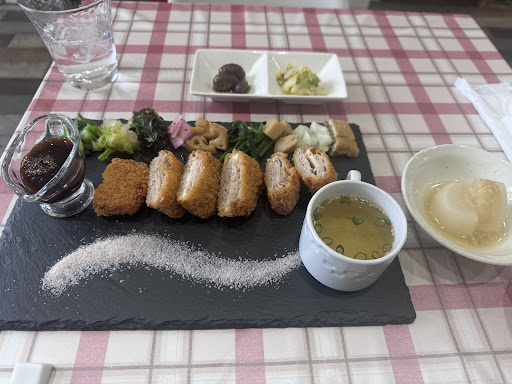冷製スープ(なんのか忘れてしまいました)→小鉢・サラダ→メイン(カツ)と言う流れで提供され、定食と言いつつランチコースの雰囲気を味わえてむっちゃ良き。 冷製スープは、アクセントで辛子が入ってるのか、ピリッと締まる部分もありむっちゃ美味しい! メインのカツプレートには、これでもかと箸休めの副菜がならべられており、むっちゃ豪華。 ミルフィーユカツは豚の歯切れがよく、さらに衣がガリガリと言っても過言ではないくらいサックサクでむっちゃ美味しい! 塩とソースとで味を変えられるのも良き 副菜の玉ねぎの甘酢漬け?ピクルス?が個人的に刺さりました笑 また、小鉢にはムカゴの煮物があり(日替わりなのか?)あまり見かけない食材も堪能できて最高!