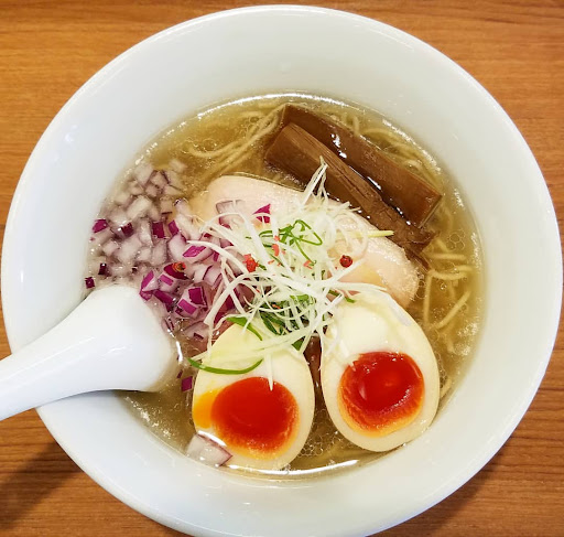 友人から京都で食べた塩ラーメンが美味しかったので都内で似ているものが食べたいと連絡あり。画像を見ると一粒万倍のようだったので同じINGS系で動物系の塩があるこちらを訪問しました。土曜12時過ぎで待ち無し。私は塩らぁ麺をいただいたことがあるので煮干そばにしました。