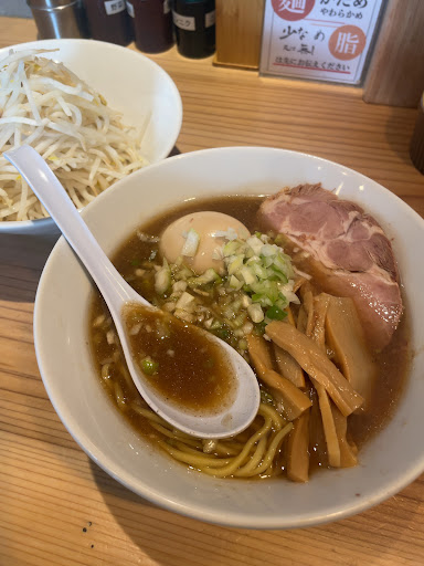 Read moreお昼時に訪問 初めての店で緊張した 店内に入るとオシャレなジャズBGMと遅れてちっちゃくいらっしゃいませの声 客は席が1席余るくらいの人数で、食券を買う際に後ろに列ができていたから人気なのだろうか。 食券制らしいが出てくるのは札、 また食券機の書いてある内容が意味不明 どれを頼んだら自分の好みになるのかがわからないため、とりあえず初めての店での自分ルールで、中華麺の細麺900いくらかを選んだ。少し高い気がする。 食券(札)を購入後空いている席があったため着席。 席は仕切られているため他の客を真似するとかが難しい、かつ自分が来た時他の客は皆着席していて、ひと段落ついた時だったため何をしたらいいかよくわからない。 なんの指示もなくとりあえず壁にある指示的なものを読む。 がこの間終始店員は無口。 ほんとにどうしたらいいのかわからなくて、すみませんと呼ぶが無視される。 とりあえず購入した札と、席にあった野菜増量の札をカウンターの上に置き待機。 これがあってるのかすらわからないが他の客(食券購入時に並んでいた客)が自分の真似をしたため勝手にムーブが形成された気もする。 ちぢれだとか柔らかさとかニンニクがどうとか聞かれるわけもなく五分間が経過 急にもやしが置かれる。またその1分後くらいにラーメン着。 よくわからないまま食べ進めるがよくわからない味。 特段美味しいというわけもなく自分としては薄く感じた。 食べている間他の客が、前述した野菜マシマシなどのふだを勝手にカウンターに戻して怒られていた。 そりゃそうだろ訳がわからないんだからこれであってるのか不安になるだろと思いつつ啜り続ける、も終始味がわからない。 とんこつなのか海鮮なのか醤油なのか全くわからないまま啜り終え、ごちそうさまでしたと言い放ち退店。 この店の方はいらっしゃいませと、はいお待ちと、ありがとうございました、しか言えないみたいでごちそうさまでしたと言ったのにも関わらずそこにはありがとうございましたの返事はなし。 退店時にありがとうございましたーと適当な声が聞こえた。少しイラッとした。 店の立地だとか店内の雰囲気はめちゃくちゃオシャレでそこだけはいいが、1人で初めて行くには...