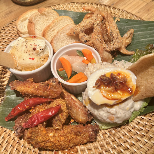 ■タパス5種盛合わせ お店人気の5種がどどんと入った3人前くらいあるボリュームのお得な盛合わせ! 木の篭なのが雰囲気抜群🥳