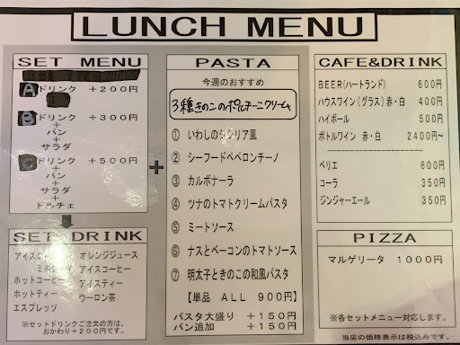 ランチで利用致しました。十二時を過ぎると一気に混んでくるので、十二時前がおすすめです。ご近所の方の間でかなりの人気店のようで、席がほとんどいっぱいになってしまいました。 ランチメニューは、パスタが5、6種類とピザ。単品でも、サラダ付きセットでも、デザートつきセットでもいけます。
