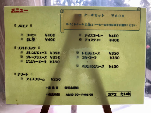 Read moreカフェ たいむ は、店の隣なので1、2か月に1回は、ケーキセット 6百円 のティーたいむを、ママ一人で営業していて、 お話がはずんでいる❣ホットCoffeeも゙、ホットティーが2杯分のタンブラーで、入っているので冬場から春先までは、身体が温まる。ちょっと暑いとき、物凄く暑い夏は、Ice Coffeeとティーは、物凄く濃いが飲みやすく口どおりが良くて、とても美味しいよ。寒い時期は、イチゴロールと、アップル ケーキ 2月だけは、パッションフルーツ シフォン ケーキ 夏と秋にも、ありますよ。ケーキのお変わりは、 2百円ですよ。お店は、1年中 夏 です。アロハのミュージックを、聴きながら夏の展示物が写真が、張り付けています。私は、近いうち...