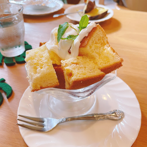 カフェのママさん全て手作りのスイーツはどれも絶品!!私はきんかんのシフォンケーキを最初に注文。ふっっかふかで美味しい!ベーキングパウダーを使ってなくて卵白だけでフワフワに!