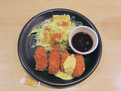 「カキフライ」:399円(税込、以下同) 味3.4点/CP3.9点 年内12/31までサンキューフェアなるものが開催されていて、幾つかの料理が通常よりもかなり安く提供されています。この料理も通常659円のところを399円で提供しています。 広島産の牡蠣だそうです。まぁまぁ美味しい。タルタルソースも中農ソースもどちらも供されるのは親切。「辛し」も一緒に配膳されました。