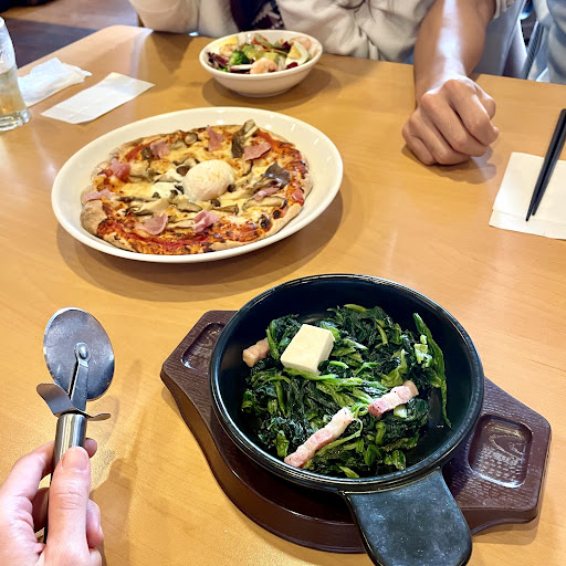We ordered drink bar, beers, salad, spinach, chicken, deep fried chicken, steak and hamburg steak, also a pizza for sharing. The pizza was good. I had the chicken with spinach and mushrooms, they tasted good with the mushroom sauce, but the portion of the mushroom sauce is not enough at all. All of the food was good and normal, nothing too special.
