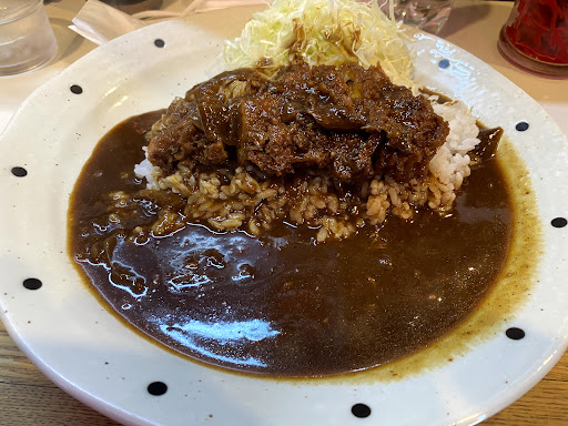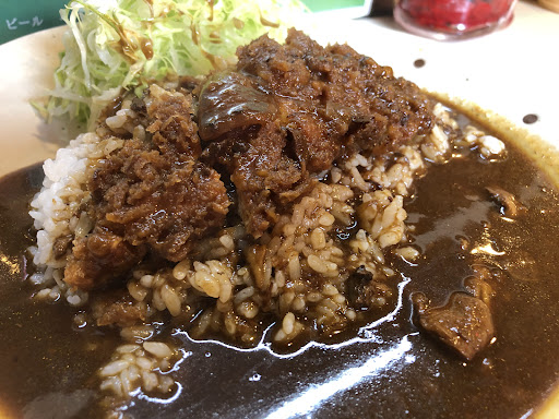 5分強でご提供されます。馬場南海ほどの真っ黒ではありませんが、黒っぽいルーのカレーライスが提供されます。 カツはやや小さめながらカラッと揚がっていて美味しい。付け合わせのキャベツ千切りも良い箸休めになります。