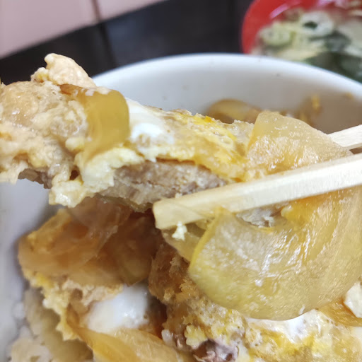 早速実食です。カツ丼は多めのご飯に多めのタマネギと甘辛タレがしっかりしみてます。カツは大きめのフルサイズのカツの半分くらいですが肉厚がしっかり認識できる厚みです。