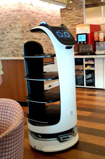 ◆猫型ロボット 料理を運んだりお皿を下げたりする、猫型ロボットが働き始めました。 マスクをしないで話しかけるお客さんから店員さんが守られ、省力化もはかられるわけですが、それ以前にとにかく可愛い!瞬きして音楽を流しながら進み、語尾に「にゃ」をつけて喋ります。ただし、行けば必ず猫型ロボットが運んできてくれるとは限らず、人間の店員さんが運んでくれることもあります。