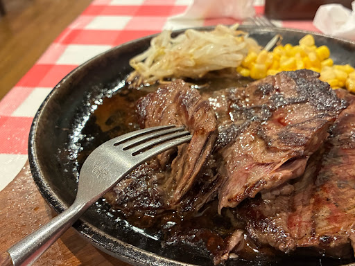 2025年5月、休日の13:50頃に訪問。席数はけっこう多く、先客は4人ほどいらっしゃる。テキサスハラミ320gのセット(2,000円)と、ライスは大盛り(無料)としてくれるよう口頭で注文する。すぐにミニサラダがサーブされ、「ドリンクはセルフで取ってきてくださいね」と案内される。ドリンクテーブルにはウーロン茶、コーヒー、水の3種類が並んでいて、今回はウーロン茶をいただく。ウーロン茶は苦くてややえぐみを感じるハードなタイプ。これを飲みながら待つこと5分くらいでステーキが到着した。鉄板に2枚の肉が横たわっている。7ミリくらいのやや薄めの肉に、ナイフを入れるとスッと切れる。まずは塩と胡椒で食べるとする。やわらくて弾力があり、ギュチとした締まりも程よくていい食感。レバーのような血の匂いがかすかに香って、これが妙に肉のライブ感につながる。卓上にソースは3つあり[店長おすすめ]はエバラ焼肉のたれの味、[塩ダレ]はしょっぱく、[ピリ辛スパイシー]は辛さが差し込むが甘さも強くて重くキレが悪い。塩と胡椒が一番好みでした。大盛りライスは330gくらいとあると思われる。保温器で焼けてドライな舌触りになったのだろう。干し草のような匂いをほんのりとまとっているが、こういうライスは好きだ。ミニサラダはドレッシングを掛けた状態で作り置きしているのだろう、しおれていて生気がない。最後にササっとかっこむように食べる。ごちそうさまでした。肉食った感は十分に得られましたし、コスパもなかなかいいと思います。
