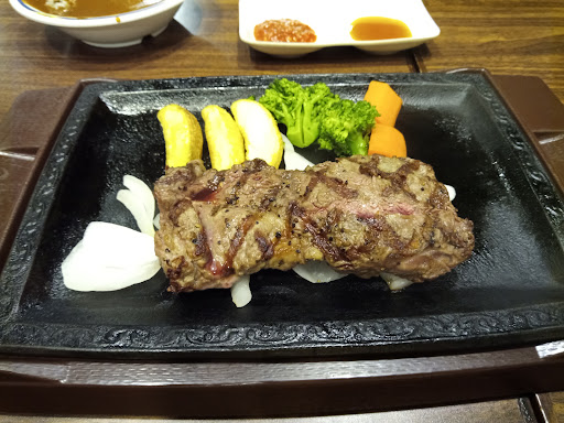 ミスジステーキ(150g)にサラダバー&カレーバー、ドリンクバーを注文 ステーキが出てくる前に、とりあえずサラダとカレー サラダ×2、カレー×2を食したころにステーキ登場です 特に指定しませんでしたが(そもそも出来るかわかりません)、焼き加減はミディアムレア テーブルにはステーキソース2種、塩・胡椒、小分けわさび、小分け柚子胡椒あります、あとサラダバーの隣にもステーキソースがあるのでお好みで ステーキそのもの(+付け合せのイモとニンジン)に味ついてません 多少スジの部分がカットしにくかったですが、あまり舌が肥えていない私には十分美味しいお肉でした 日替わりカレー&ご飯も美味しかったです
