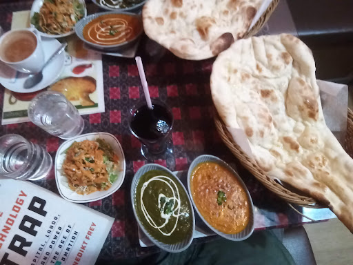 I went with the two-curry set, and both the saag chicken and dal were good. Strong spice level. The naan had a little tumeric if I'm not mistaken, and was tasty, but a bit unevenly cooked. Average salad and overall calling it a solid four stars pushing for...