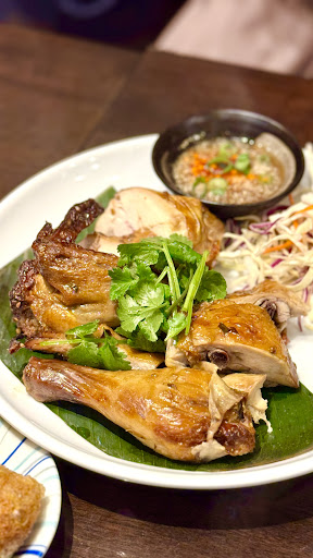˗ˏˋ 注文したもの ˎˊ˗ 《料理》 🎖️ガイ・ヤーン 1/2羽 1,580円 タイ東北部の伝統料理🇹🇭 回転式グリルで余分な油を落としながらクルクル回してじっくり炙り焼きしてるそう🔥特製ダレに漬け込んで焼いてるから、そのままでも美味しいけど少しピリ辛な自家製つけダレ(ナムチム)をかけて味変も楽しめちゃう! 外パリ!中はジューシーぷりぷりで絶品! 少し骨が多いので注意⚠️