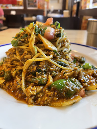 カレーパスタのカレーは好きなカレーで作って貰えます、私は一番無難そうなキーマカレーパスタを3辛で注文。 到着したのはヒマラヤみたいに山盛りのパスタ たっぷりのキーマに玉ねぎやピーマン、いんげんの歯触り良く美味しい。 イタリアンのボロネーゼ等より、余程食べ応え有り良い!(パルメザンがあれば尚良かった) ボリューム満点で、最後のデザートは辞退 男性にも足りる量だと思う。