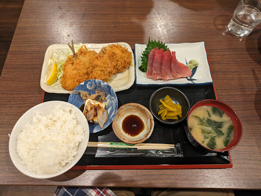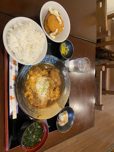 Trong lần ghé thăm một quán ăn Nhật Bản truyền thống, tôi đã có cơ hội thưởng thức một set ăn cực kỳ chỉn chu, đầy đủ dưỡng chất và đậm đà hương vị Hương vị: Món thịt heo chiên mềm bên trong, giòn rụm bên ngoài, hòa quyện với trứng béo ngậy và nước sốt ngọt mặn vừa miệng – đúng chuẩn hương vị comfort food của người Nhật. Cơm trắng dẻo, thơm, ăn kèm rất “vào”. Croquette cũng rất ngon, lớp vỏ giòn rụm, bên trong mềm mịn, thêm chút mayonnaise tạo điểm nhấn béo ngậy. • Trình bày: Mọi món ăn được sắp xếp trên khay gọn gàng, đẹp mắt. Bát đĩa sứ kiểu Nhật tăng phần thẩm mỹ và tạo cảm giác truyền thống, ấm cúng. • Giá trị dinh dưỡng: Set ăn cung cấp đủ tinh bột (cơm), đạm (thịt heo, trứng, croquette), chất xơ và vitamin (dưa chua, rong biển). Một lựa chọn rất cân bằng cho bữa trưa hoặc tối. • Phục vụ: (Không có thông tin cụ thể trong ảnh, nhưng nếu đây là quán ăn kiểu truyền thống Nhật, thường phục vụ rất chu đáo và nhanh gọn.)