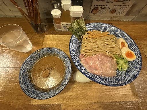 鰹節が香る出汁でサブタイトル通り、めくるめくドロドロの世界。 ドロドロなんだけれど、絶妙な甘さも感じ、 塩っけが抑えられているからか 重くなくてするっと入っちゃう。 つけ麺ってスープがどんどん薄くなり、 冷めてくると味わいが変わっちゃうことが 多いのだけれどこちらは全くそんなことなく、 最後まで印象変わらずいただけます。 麺は茶色くてうどんぐらいもっちもちで 食べごたえがすごい。 麺、つけ汁、共に強烈な存在感。 だけれども一緒に食べると お互いいい感じで混ざり合い、 まさにめくるめくドロドロの世界(笑) 低温ローストレアチャーシューはそのまま食べても つけ汁につけてもどっちも美味しく。 つけ汁を薄めるスープも卓上に設置されていて 最後の一滴まで楽しめます。