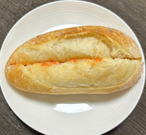 『明太子フランス』 小麦の甘みや風味をよく感じられるパン生地がかなり美味しい。 外はパリッとしつつ軽く、中はしっとりと、そしてもちっと感じる。 中はびっくりするくらいピンク色の明太子。 とくに調味料と混ぜることなく、シンプルにそのまま明太子。 ハード系の明太フランスも美味しいけど、もちっと系もいいかもと思わせる。 パンそのものが美味しいからこそ、シンプルでも美味のかもしれないが。