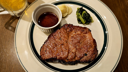 ポークステーキ 高尾山(270g)と生ビールを食べました。注文してから5分程度で出てきました。ポークステーキなので焼き加減は無く、しっかり火が通ってます。硬さは写真の左側は脂身が少なく、肉の密度が高いので硬めですが、硬くて噛み切れない事は無く、程良い弾力でした。右側は脂身が適度に混ざるため柔らかくなってました。どちらもしっかりと肉の旨味があって美味しかったです。 ソースはオニオンソースが付いて来ましたが、塩コショウで食べるのも良かったです。味変用にワサビやマスタード等が用意されていて、ワサビを使いましたがこれも良かったです。 270gの分量はライスなどをつけなかったのでお昼には丁度良かったです。お腹いっぱい食べるならギリギリ富士山(450g)までは...