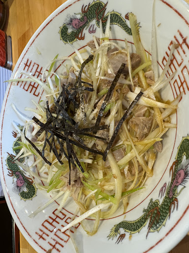 着丼すると、豚骨ラーメンが到着 まずネギが九条的な切り方で期待感アップ、チャーシューがマットな質感かな、スープは濃度薄めな仕立てかなっていう見た目の感覚。 まずチャーシューを食べると感覚通り、うまいっとはならないがパサッとしてるが食べ応えある大判タイプで薄造りの個人的には好みなタイプ。 スープも大体想像に近い味わい、麺はちょっと粉感強めすぎなタイプでバリカタ以上の固さはまとまりがなく多分粉をより強く感じやすいやつ。
