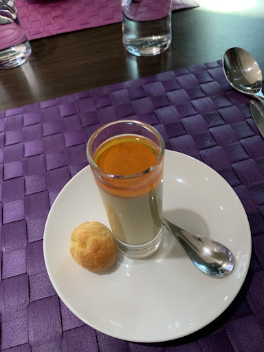 ▼ナツメグ風味のフラン アミューズ1品目はプリンのような出で立ちの一品。洋風の茶碗蒸しとでも言うのか、タマゴの味わいとほんのり香るナツメグの風味が繊細でこの後の料理の期待値が爆上がる。器の底面にペッパーが入っており、ピリリと締められるのも◯