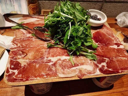 ■元祖!イタリア産&スペイン産 生ハムとサラミのてんこ盛り ハーフ(~2名様)880円 ハーフでもこの大きさ!びっくり! 野菜やマッシュルームも各300円ずつでトッピングしてみました。 添えてある黒いもの、、、オリーブかと思ったら半分凍ったぶどうでした。ハムで包んでいただくとこれまた美味!