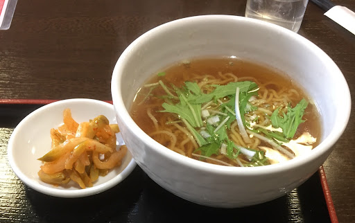 典型的な町中華の中華麺。極細縮れの多加水麺。多加水でありながら硬めの麺であるのは、グルテンの多い輸入強力粉とかん水で力強く圧延しているからであろう。しかし鼻から抜ける匂いには悪いかん水臭さもなく、良い製麺所だ。 ただし硬い麺を目指しすぎて茹で時間が短め。麺を噛んだ最後のクニっとした食感はまだ小麦粉が充分糊化されていない。あと30秒でも長く茹でていれば随分違う印象となるだろうに惜しい。