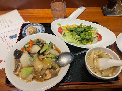Read moreGreat value Chinese. For lunch we had one of about 10 set menus with soup, a small salad, spring roll and dumpling, bottomless rice, main dish, and coffee for ¥1300. My Mapo tofu was nice, rich and spicy. It's a seafood specialty place, in the distinctive building with the...