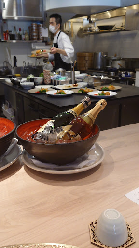 職場の近くにある行ってみたかったヌーベルシノワのお店。広めの通り沿いにあるお店で、入店するとカウンターがメインになっており料理を作っている様子を見ながら食事を楽しめる配置になっています。楽しみ。 今回いただくコースは「芙蓉コース(税込13,200円)」。