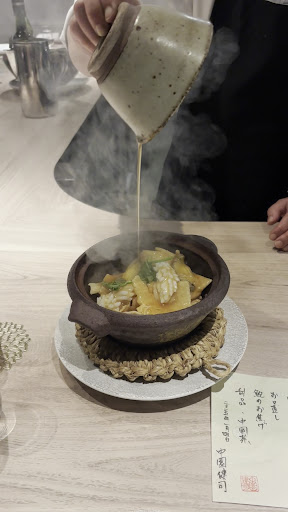 8皿目 ・五感で楽しむ鮑のおこげ これは美味しい、むちゃくちゃ美味しい。さすがスペシャリティです。 塩味と酸味、そして出汁の組み合わせが絶妙です。それに、出汁を吸い込んだおこげが最高の状態でその出汁の旨味を舌に運んでくれます。 鮑との相性も良いですね。鮑の弾力とおこげの溶ける食感の組み合わせが良いです。