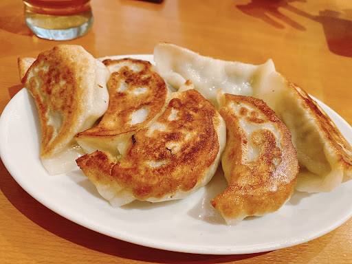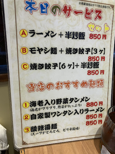 Read more日曜日の13時近くに伺ったところ 近所の常連さん複数組がそれぞれ大声で宴会状態でした。 ほぼ満席で入店したからか、 ホールの方がちょっと迷惑そうな顔でしたが 入り口前の席を指定してくださってので 直ぐに、本日のサービスセットのAとCをお願いしました。 宴会状態のお客様のせいか?注文品はなかなか出てこなくて、ちょっとヤキモキ 散らばった盛り付けの餃子が一番始めに来たんですが、それだけ食べても仕方ないので そのまま、しばらく待っていたところ チャーハンが出てきました。 こちらも、もう少しちゃんと盛り付けてあったら印象が違うのにと思いつつ、 私の注文は揃ったので、チャーハンと餃子で食事を始めました。 味は好き嫌いがあるのでなんとも言えませんが餃子🥟の皮が厚く脂が多い感じ、チャーハンはパラパラ感が無くて、ちょっと焦げていました。 連れの注文の半ラーメンはチャーハンが食べ終わるまで出て来なくて ちょっと、残念でした。 しかし、お安いので仕方ないのかなぁ? それにしても、トイレ前の荷物は消防法...
