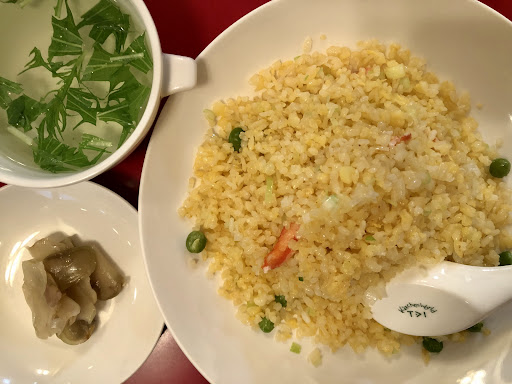 金色に輝くチャーハンは具材こそ海老、ネギ、卵のみと極めてシンプルだが、コメの一粒一粒が油と卵できっちりとコーティングされ、見事なまでにふんわりパラパラに仕上がっている。 その上、余計な油っぽさはなく、塩気もジャスト。 いや〜、これはマジで旨いですよ!まさにプロが作るチャーハンだ。 海老チャーハンだけに海老もゴロゴロ入っているし、ボリュームも申し分ない。 パラパラ系チャーハンの魅力を再確認させてくれる至高の一皿である。