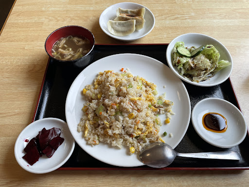 本日のサービス定食2(五目炒飯+餃子3コ)を注文。 以前は駐車場が近くに無かったが、すぐ向かいのマンション1階がコインパーキングになっていたので訪問。 店内がスッキリした気がするが、模様替えしただろうか。広々として居心地が良い。 五目炒飯はいわゆる町中華のそれでなく大陸系中華料理店の味。コーンのせいかかなり甘みが強いが、油っぽさもなく美味い。 餃子は以前と違い、成形も焼き方もしっかりして美味しくなった。 味噌汁は熱々で、漬物もサラダも良い。 そして何より、中国系の女将さんには珍しく(失礼)とても愛想が良く、「暑いから気をつけて〜」「またお待ちしてます〜」と笑顔で対応してくれた。 とても気持ち良く、また来たいと思わせてくれる。