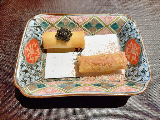 ●ピータン豆腐 冷たい押し豆腐を細く切り、トマトのコンソメでまとめている。ピータンの卵黄がコクを添え、卵白と葱の清涼感が全体を引き締める。最初の一皿として口が整い、その後の香り系の皿へ自然に橋渡ししてくれる。