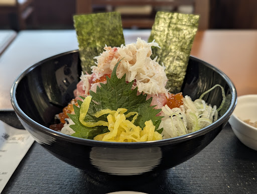 Met my friends for lunch after visiting the Great Kanto Earthquake Memorial Museum. . I ordered Chirashi Bowl. The sashimi included salmon, tuna, amberjack, sea bream, shrimp, scallop and salmon roe. The amberjack had a firm texture, and the salmon roe was succulent. The set also featured miso soup and a dessert. While the sashimi was fresh in general, the slices were a bit thin.