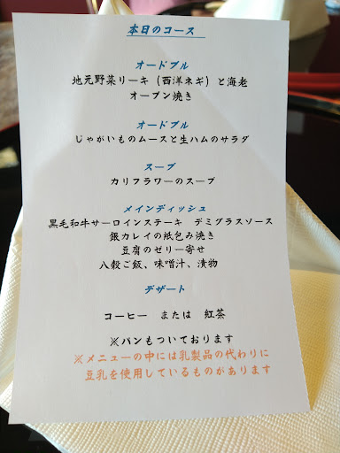 本当は他の店に行くつもりだったのですが、そこが満席で、Googleマップで近くのレストランを調べていたときに見つけました。 「こんなところに本当にレストランがあるの?」と疑いつつ、ナビに従って上り坂を進んで行ったら、たどり着きました。 そしてたどり着いて初めて知ったのが、予約制の店だということ。でも、この日は事情を知らなかった私たちを温かく迎え入れてくださいました。店に入ってから店のウェブサイトを確認すると、確かに「予約制」と書かれています。と同時に、ドリンク1杯が無料になるクーポンもウェブサイト上に・・・。私のスマホ上にそのページが表れているのを、お店の人が見つけて、なんとずうずうしくも、予約もしていないのにクーポンまで使わせていただきました。 ランチは3,600円の1コースのみ。 創作フレンチというのでしょうか、和の食材が上手に使われた数々の料理は上品に盛り付けられていて、どれを食べてもおいしかったです。 店の雰囲気はまさに「森のレストラン」。大きな窓から、この建物が緑美しい木々に囲まれているのがわかります。時間が経つのも忘れてゆ...