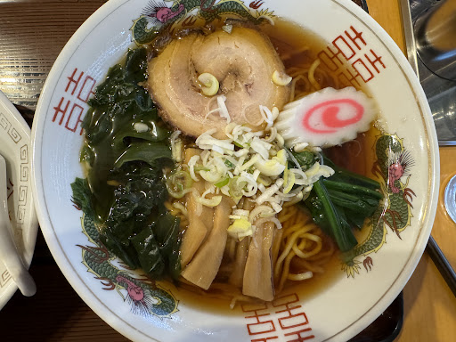 軽くウェーブのかかった黄色い麺 鶏ガラベースの透き通った醤油スープ トッピングはねぎ、わかめ、叉焼、 メンマと、ぐるぐるなると