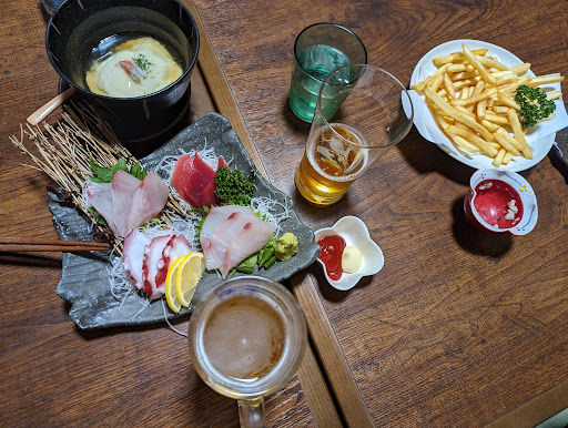 Read more夕食で来店しました。ゴールデンウィーク中だったので、出発前に予約しました。大島はお店の数が少ないので、オンシーズンは予約が必須だと思いました。 お店はまだ新しく、外観も内装も綺麗でした。店内はごちゃごちゃしていなくて、すっきり、清潔感があります。 1階テーブル席でした。奥の方、個室?か座敷?からは賑やかな声が聞こえてきました。お客さんが沢山いるようでした。 お料理は和風創作料理のような感じです。口コミを参考にお造り盛り合わせ、むろあじたたきあげ、かんぱちかま塩焼き、蓮根饅頭、和風グラタン、だし巻き玉子を注文しました。 お料理はどれもおいしかったです。お造りのさび背ごしは初めて食べた魚です。脂がのっておいしいです。ただ骨が気になって(そういう味わいとも言える)、こういうコリコリ食感が好きな人はオススメです。身はおいしいお魚でした。家族はかま塩焼きがおいしいと言ってました。和風グラタンも想像と違う料理でしたがおいしかったです。 お店も綺麗だし、お料理も美...