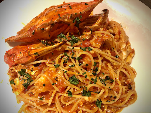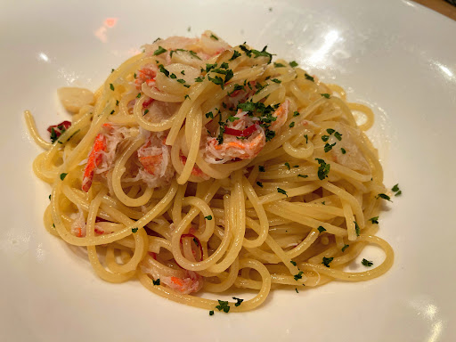 パスタは紅ズワイガニたっぷりペペロンチーノを選択。 あっさりめのペペロンチーノ。 カニも中にもう少しホロホロ入っています。 パスタの硬さもちょうどいいです。