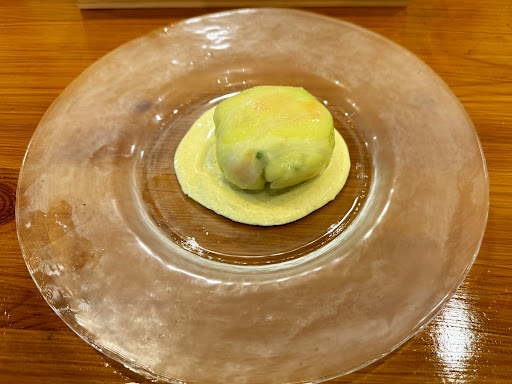 前菜のポテトサラダのキャベツ巻きはカレーソースが添えられていてまず間違えようがない相性。とても美味しかった。蕪のスープもとても優しい味付けで心が癒される思いだった。