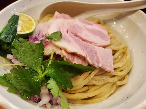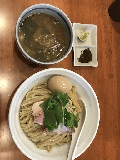 濃厚煮干つけ麺大(900円)を頂きました。 平日の12:10頃に訪問。有名店の姉妹店ということで多少並ぶことを覚悟したのですが、前には2人が並んでいるのみでした。しかし、その割にはかなり待たされ、提供されるまで約20分くらいかかったかと思います。 お店自体は綺麗で、7席あるカウンターテーブルは木目で統一されており、各席にひとつずつティシュも用意されていました。個人的には嬉しい配慮ですね。奥の方には4人がけのテーブル席が1つあり、グループの際はそちらに案内するようです。 さて、肝心のラーメンですが、ピンク色が際立つチャーシューに紫玉ねぎ、すだちのトッピングとなかなか珍しいトッピングが並んでおります。つけ麺のスープはどろりとした濃厚タイプ。残念ながら、煮干つけ麺とはいえ、ガンガン煮干しの香りがするというタイプではなく魚介系のスープにほんのり煮干の風味を感じるといった感じで煮干し感は物足りないものの、味はとても美味しい。麺の食べ応えもよく量もかなりのもの。すだちを搾っての味変、玉ねぎや薬味での味変と色々と楽しめる工夫とされており好感触でした。
