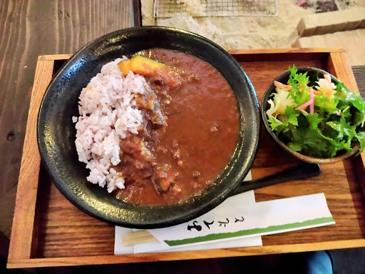 あまり教えたくない一人占めにしたいお店シリーズ(笑) 平日の金曜日11時開店に合わせて伺いました 名前の通りに古民家を改装したカフェ。 一階店内入ると、下駄箱があります。靴を脱いでスリッパに履き替えます。 外観から素晴らしいセンスと思ってましたが、店内は昔にタイムスリップしたかのような雰囲気。1階は吹き抜けとなっていて開放感あり。 火鉢囲炉裏があり、竹トンボ、骨董品などがあり、坂本九時代の音楽がより昔をよみがえらせます。 2階席から見る1階の風景は、こりゃまたレトロ感満載! 今回は、ビーフと野菜のカレーセットを注文しました。 ライスは、五穀米?サラダ、ドリンク付きでホット珈琲にしました。税込み1100円 店員さんがゆっくりしていって下さい😊この言葉は癒やされますな〜 カレーの味は、子供も食べれる味付け。さつまいもが甘くて美味しかったです✨ 一階店内入口横に、野菜の直売所がありました。 親御さんが畑をやっているそうです。 カレーに入ってた野菜も、そうかな? それと、パンケーキ食べてみたいです。 会計は、現金のみ。駐車場は、共同になっていて、舗装ではありません。1番奥の右側に市の目印になる駐車位置に看板あります。 また伺いたいと思います😊ごちそうさまでした✨Googleナビで行けました。少し店は奥まってます。写真撮りす...