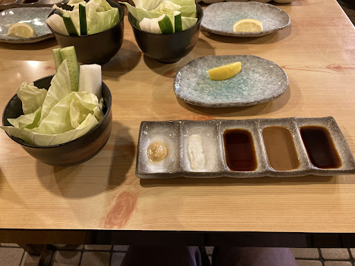 キャベツ、大根、きゅうりはコースに付いています。 そのまま食べても野菜の甘味があって美味しいですし、五種のタレからお好みで付けるのも味変できて楽しいですね。
