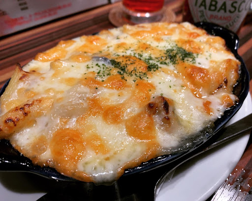 Read more趣味友の方から頂いたテイクアウトの牡蠣グラタンが美味しすぎて、どこのお店か聞いて行ってみました✨ 路地裏の隠れたお店です👍 早速お目当ての牡蠣グラタンを注文✨ 大粒で熱々の牡蠣がやっぱり最高でした😋 で…やっぱり気になってしまうのが牡蠣アヒージョ👀❤️ これまた最高😱✨ オイルにも牡蠣の旨味が😱✨ パンを浸しても…そのままスプーンですくって食べても最高でした😋 〆にパスタと決めてたので、色々な種類から選ぶと…お腹も膨れてたので濃厚系よりもさっぱり系のペペロンチーノをチョイス👍 これがまた良い✨ ニンニク多めで、これまたニンニクが美味しかった🥰 どこのニンニクなんだろう🤔? 普通のニンニク? 調理の仕方で美味しくなったのだろうか…🤔? 初めて行ったけど、嫁も気に入りまたお邪魔したいと思います😁 次は…お魚系やお刺身も食べてみたい😋 お酒が好きな人には…こってり系あり、さっぱり系ありの飽きのこないメニューの豊富さに満足出来ると思います。 お酒の種類も多めで、良いと思いますよ〜👍 牡蠣グラタンも1000円以下だし、リーズナブル...