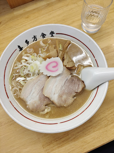 麺は太ちぢれ 少し固茹でかな? つるぷりっとしていて、芯が残るようなハリのある啜り応え トラディショナルな喜多方の麺という印象 もっとヤワめが好きだけど、つるボコっとした食感の方がが喜多方ラーメンらしさはあるのかな