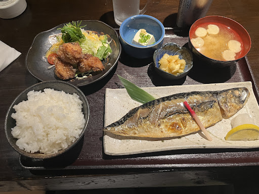 美味しい日替わりランチが1150円 月曜日の11時30分に訪問 年配の予約をしたという人達の後に入店。 次々お客さんが入ってくる。 日替わりが 鯖の文化干しとあべ鶏の唐揚げ でした。 刺身も気になりつつ、たまには焼き魚も食べたい気持ちになり日替わり定食を注文。 ドリンク付きで、リンゴジュースを。 10分かからずで到着。 鯖の文化干し 脂がのっていて美味しい。 そのままでも、大根おろしと一緒に食べても美味しかったです。 あべ鶏の唐揚げ 胸肉の唐揚げ。昔はモモ肉が良かったけど最近は年のせいかさっぱりした胸肉の唐揚げの良さがわかってきた気がする。 美味しい。 味噌汁と小鉢で冷奴、大根のさいの目に切った漬物 ご飯も大盛り、おかわりがサービス お腹いっぱいになりました。 ご馳走様でした。 美味しかったです。