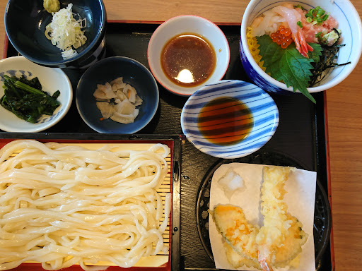 This is a typical family restaurant in Japan. Foods are Japanese style only. there is location for drink machine, wipes, water are self service. I've been here a decade ago, so I wanted to try again. My husband and I went quite early about bit after 10. My husband got a beer, seasonal rice ,and small tempura. He said rice was bit mushy and tempura was bit oily.. I got both buckwheat noodles and udon: (wheat noodles). They came with three kinds of dipping sauces, usual soy, walnut & sesame, and yam grated ones which was not fan of because it's slimy. I enjoyed the sesame ones. service lady was super helpful to order. I was happy with my meal but my husband was not ... sadly. totally forgot to take pictures,...
